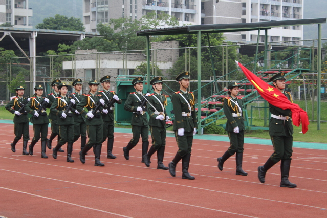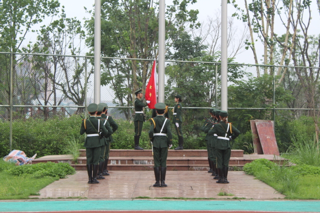 七点整,国旗护卫队着装整齐、身姿挺拔,步伐整齐铿锵,护送国旗入场。伴着庄严的《义勇军进行曲》,200多位师生庄严注视着五星红旗升空。