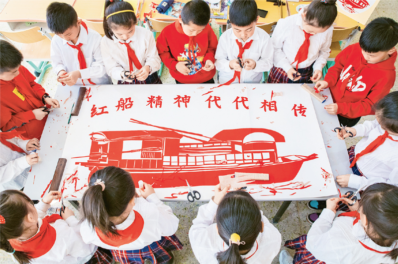 图为内蒙古呼和浩特市恒昌店巷小学开展“红船精神代代相传”主题教育活动,通过制作红船剪纸作品、讲述红船故事等丰富多彩的形式,教育孩子们知史爱党、知史爱国。 人民图片 丁根厚/摄