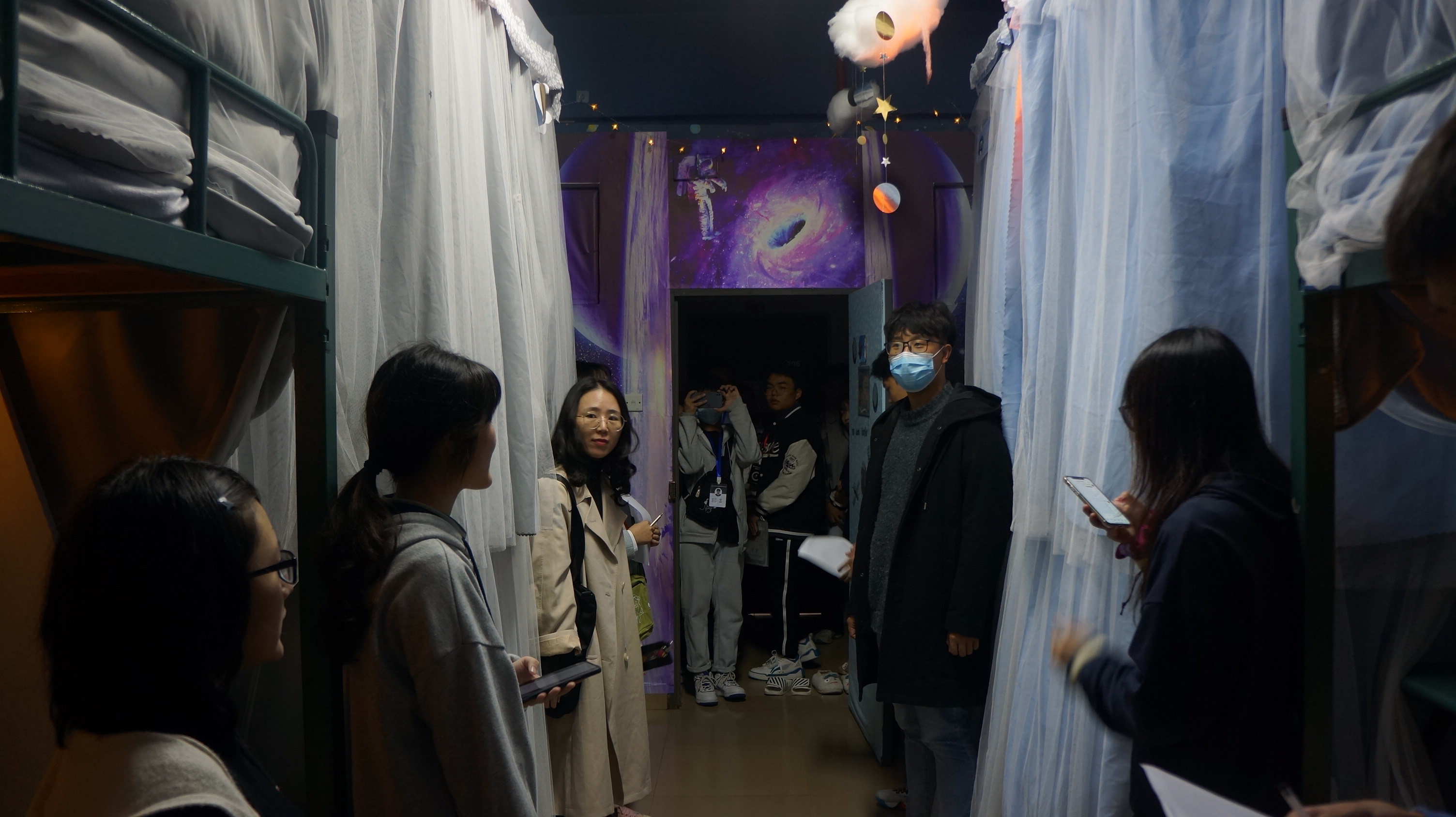 为引导大学生认真学习贯彻习近平总书记“七一”重要讲话精神,引导大学生坚定理想信念,11月18日晚,电子电气与物理学院开展第二届宿舍文化节暨宿舍装饰大赛评比活动。本次大赛由院团委副书记陈涵、辅导员吴文婷及学院团委学生会主要学生干部担任评委,分别对2021级全体新生宿舍以及其它年级参赛宿舍进行现场打分。
