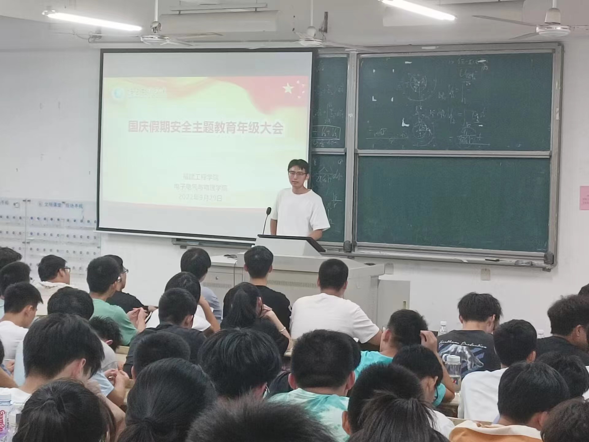 为了保障同学们的人身和财产安全,促进同学们身心健康,让同学们过一个文明、平安的国庆假期。9月28日、29日晚,电子电气与物理学院通过线上线下相结合的方式召开国庆节安全主题教育大会,会议分别由2022级新生辅导员田富学、陈燕主持,2022级全体本科新生参加会议。