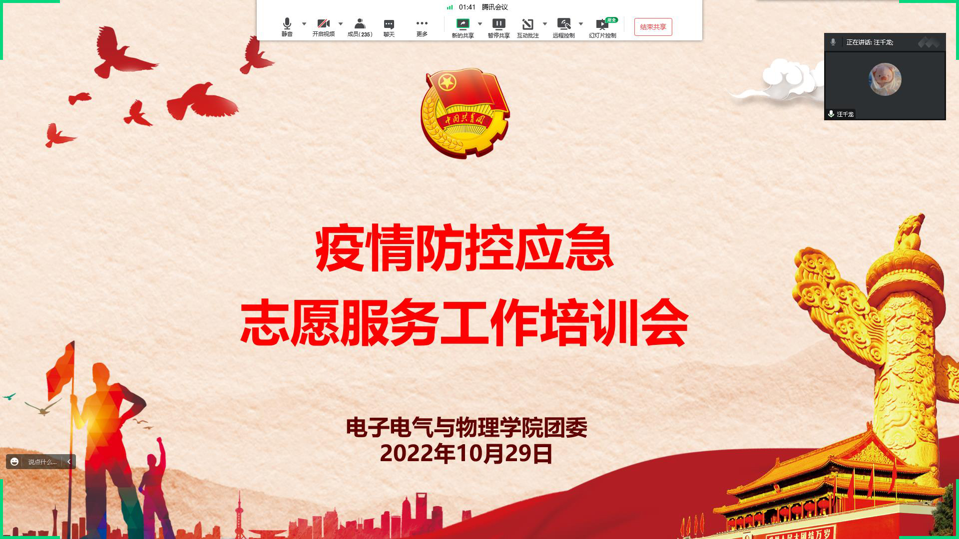 为了提高应对突发状况的响应速度和志愿服务效率,10月29日晚,电子电气与物理学院通过钉钉平台线上组织召开疫情防控应急志愿服务工作培训会。院团委书记陈涵、各年级辅导员、谦园1号楼、和园3号楼、和园6号楼楼长、层长、舍长及相关疫情防控工作人员参加此次培训会议,会议由院团委学生副书记汪千龙同学主持。