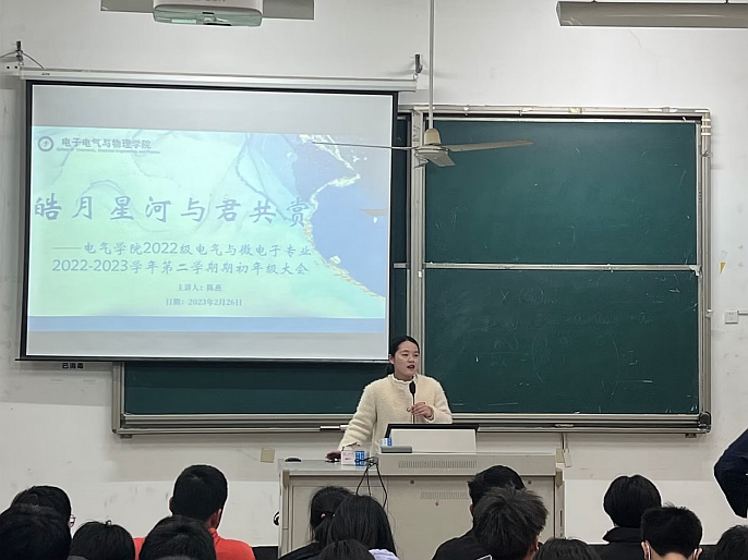 2月26日晚,电子电气与物理学院2022级于旗山北校区大教西-1、大教西-3召开2022-2023学年第二学期期初年级大会,会议由辅导员陈燕、田富学主持,学院2022级全体本科生参加。