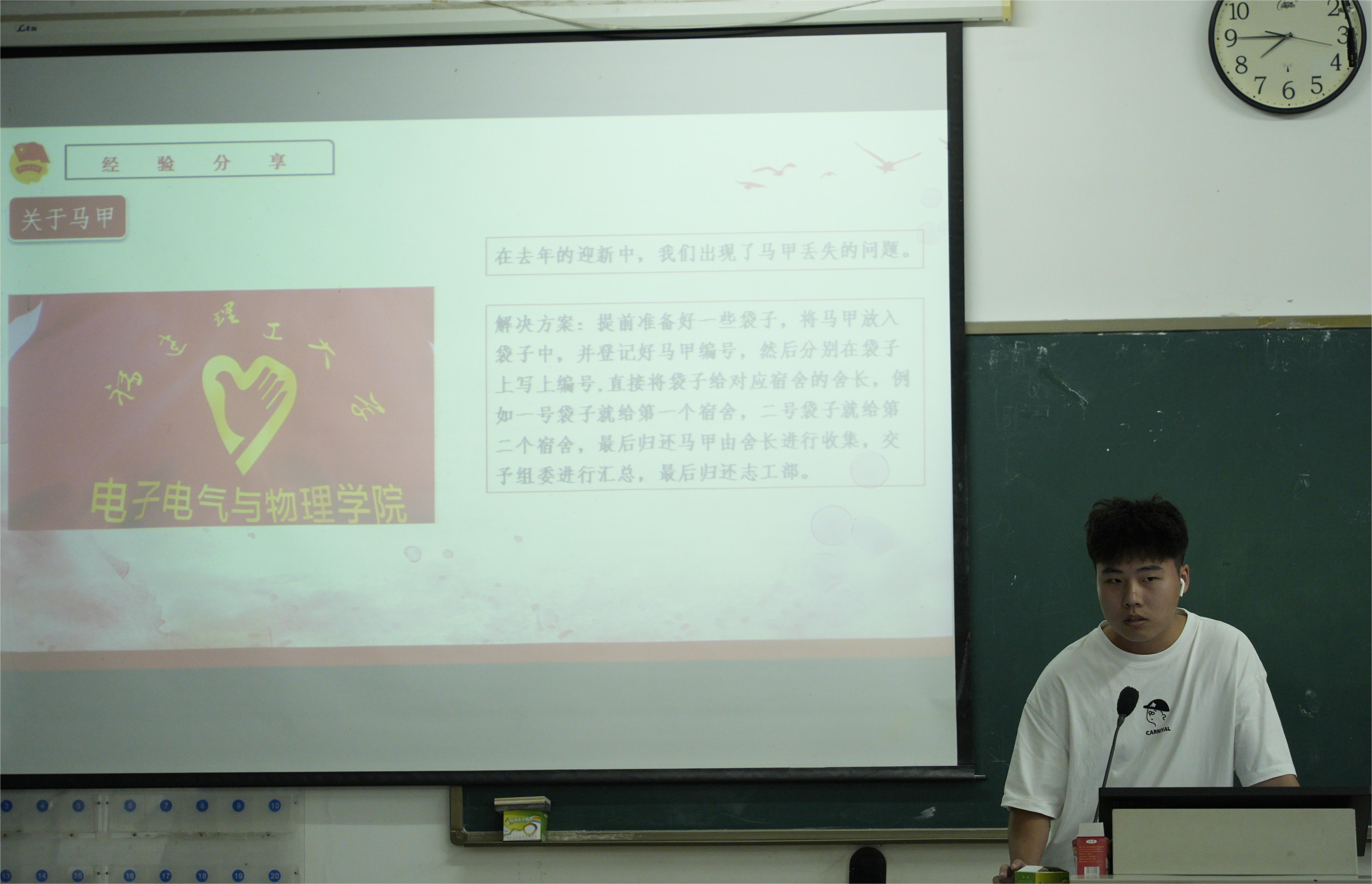 首先,陈乐同学先对迎新工作做了简单介绍,并对迎新工作做了详细要求,以确保迎新工作安全、顺利、有序开展。会上,张星光同学代表往届迎新工作志愿者进行了经验分享。最后,院团委书记陈涵强调,志愿者们服务新生的同时要保障自身安全,通过志愿活动拓宽视野,培养创新、合作和领导能力。通过细致周到的志愿服务让新生切实感受到学院的亲切和温暖。