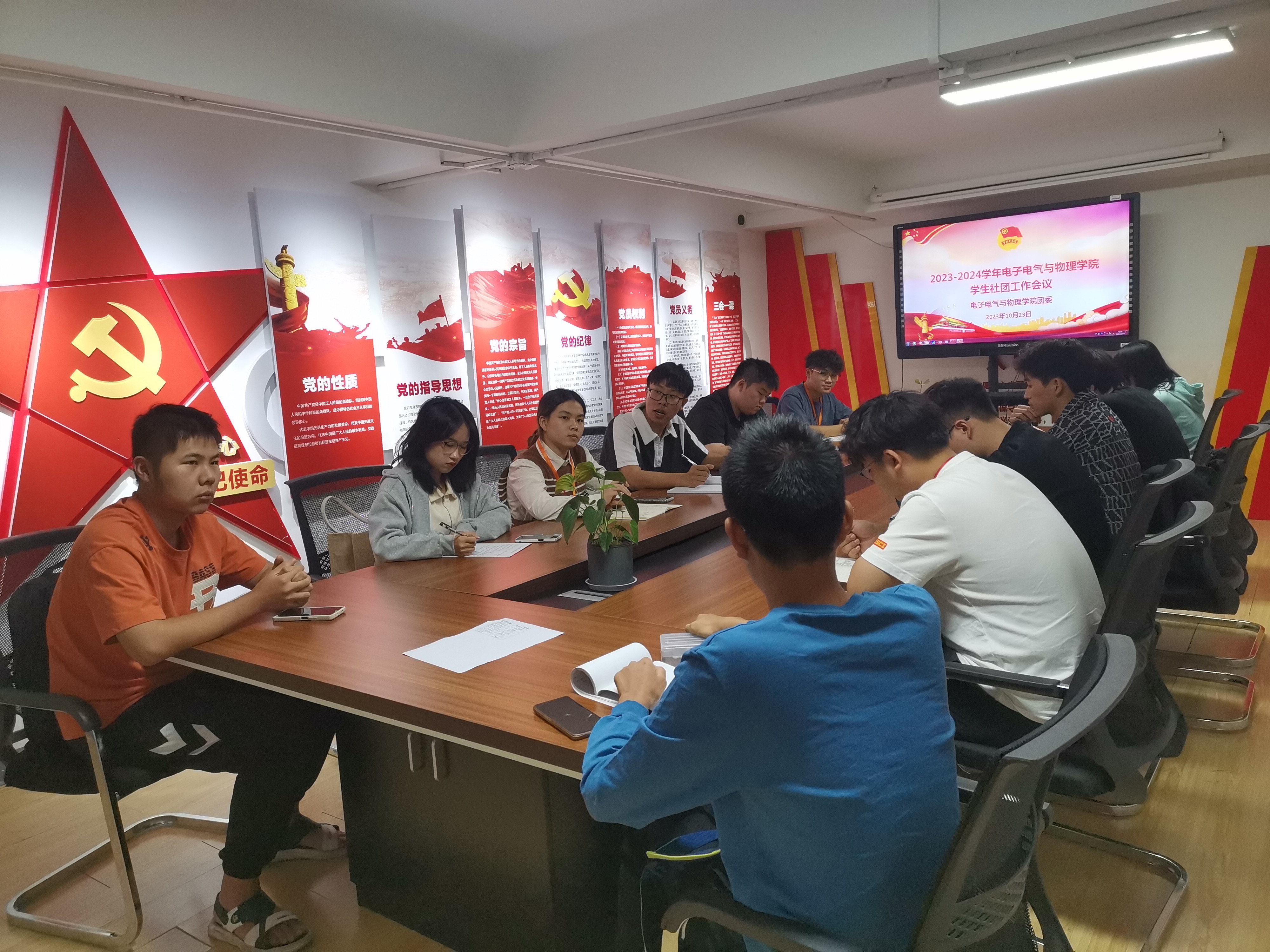 为进一步提高学生社团的管理水平、增强学生社团组织能力,引领学生社团高质量建设与发展,10月23日晚,电子电气与物理学院于旗山北校区和园C3“索仕图”党建育人中心召开2023-2024学年学生社团工作会议,院团委书记陈涵、院学生社团联合会及院创新创业创造服务中心负责人、学生社团负责人共计十余人参加会议,会议由院学生社团联合会负责人王栋梁同学主持。