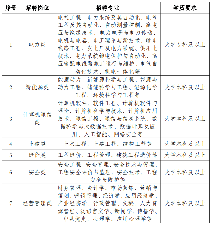 备注:电力类招聘岗位,可适当招收部分优秀的中专、中技、高技学历应届毕业生。招录的此类毕业生将全部安排至施工企业一线班组岗位,且在一线班组连续工作年限不少于 8 年。