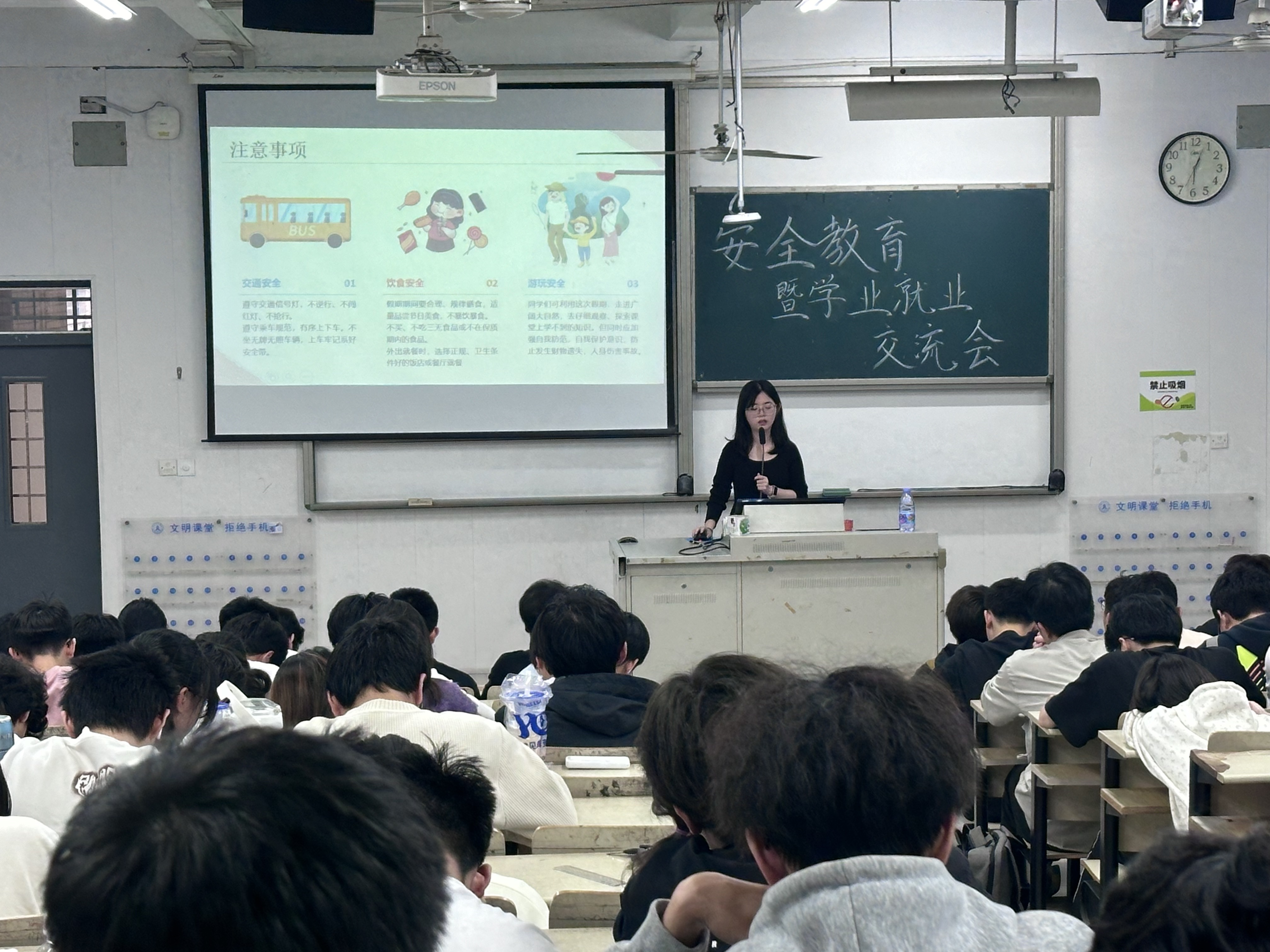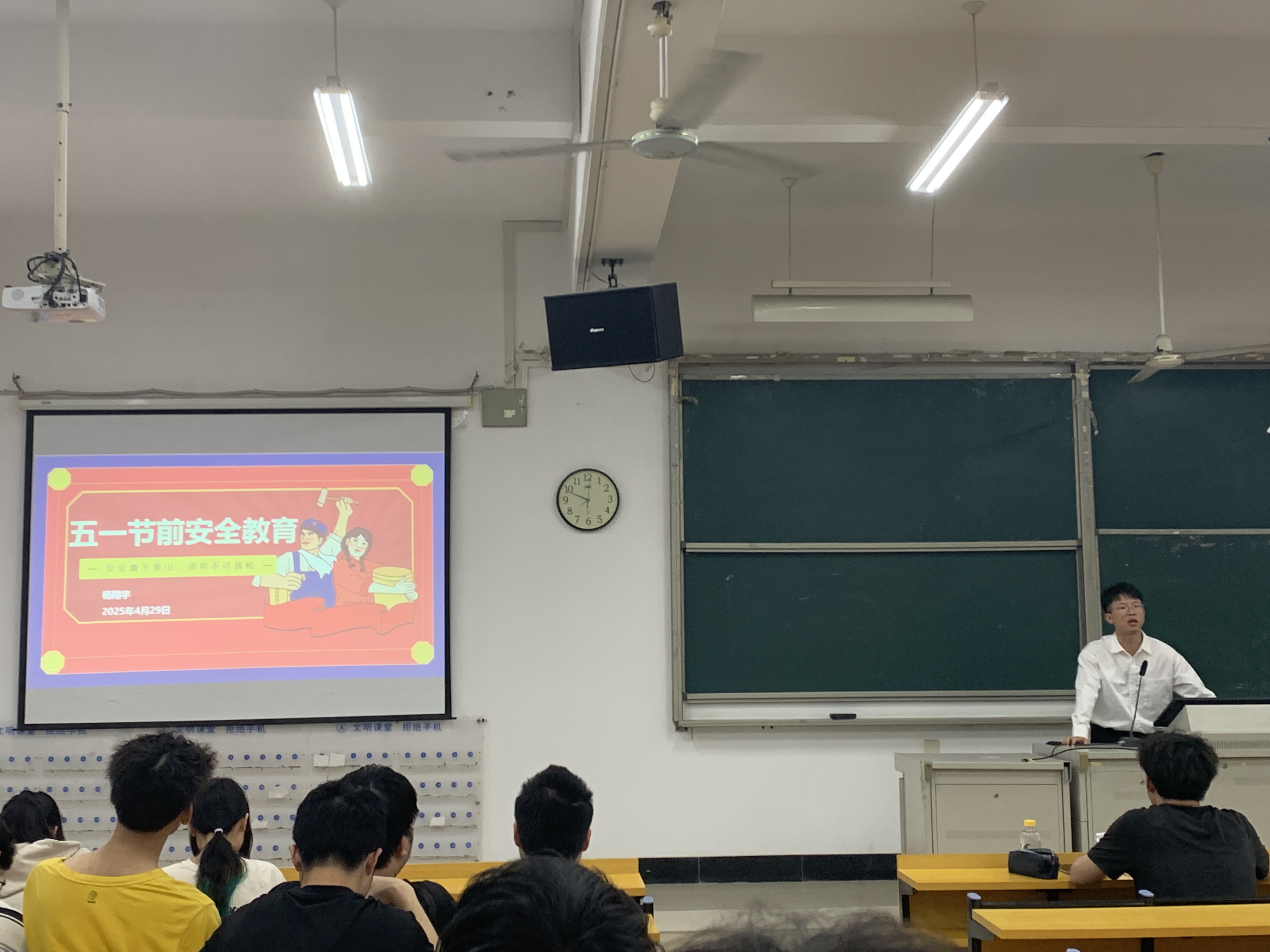 4月28日,电子电气与物理学院于旗山北校区大教东1教室召开2023级五一节前安全教育大会暨升学就业经验交流会,会议由辅导员金烨、杨翔宇主持,学院2023级全体专业本科生参加。