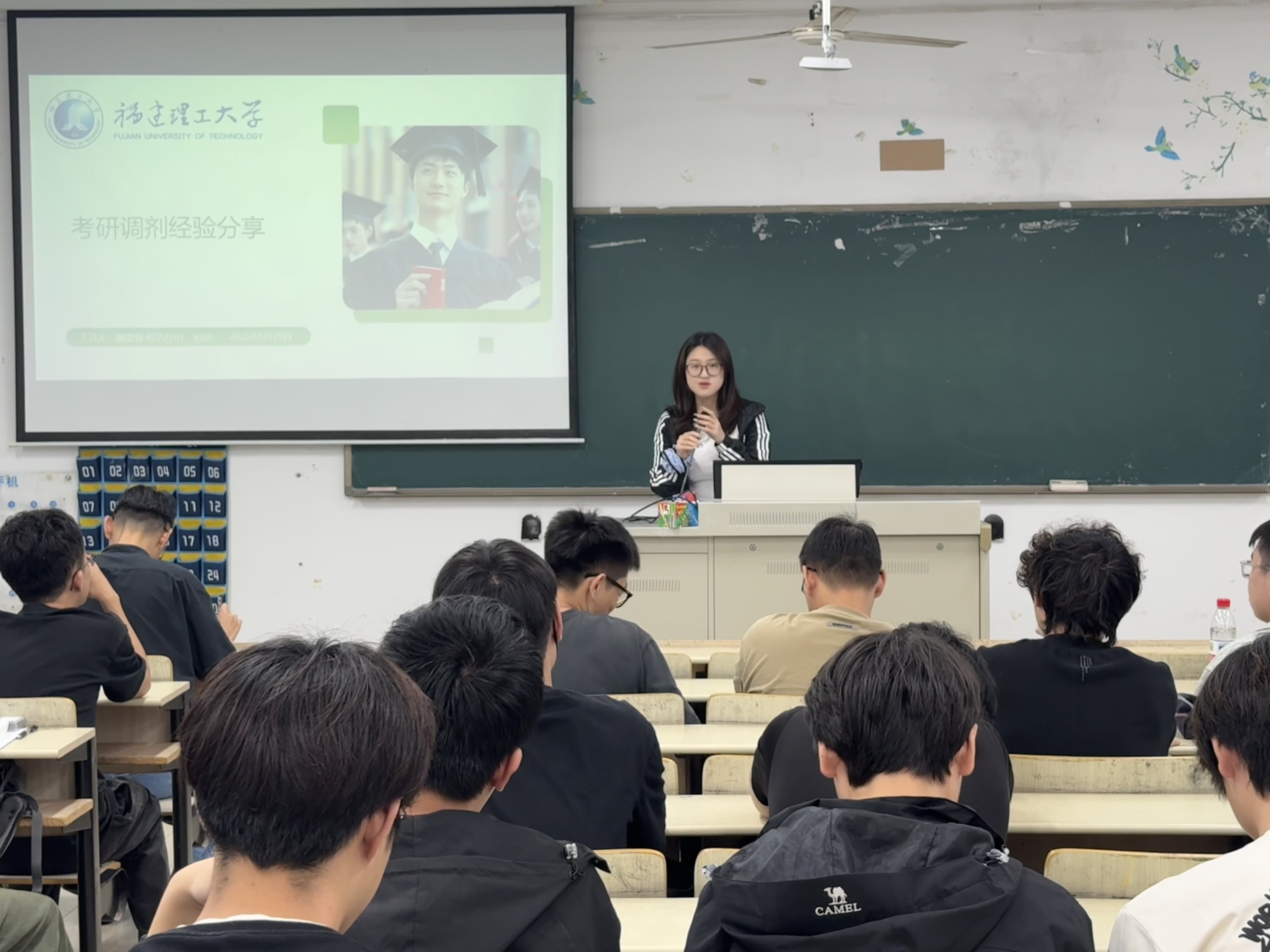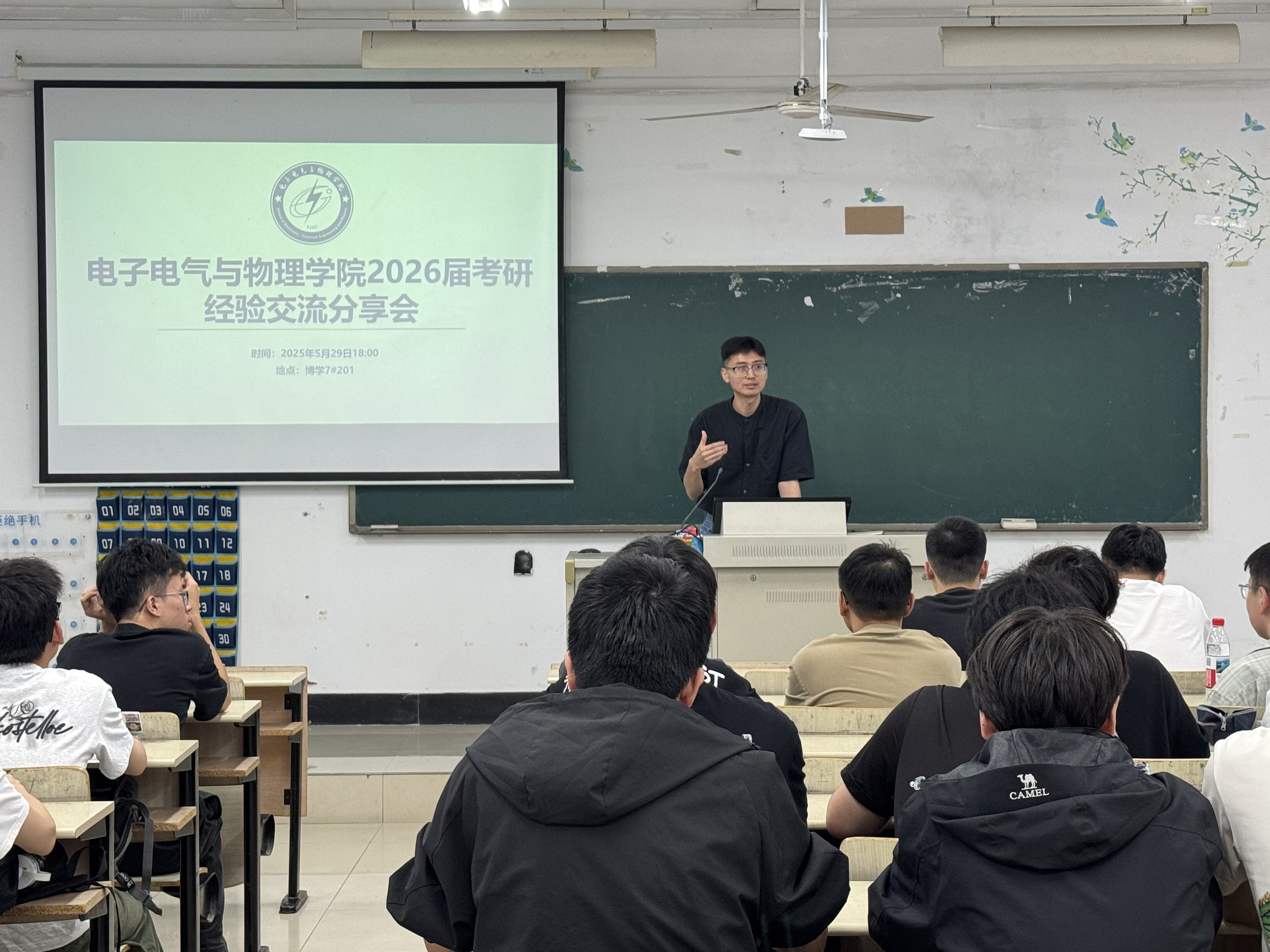 5月29日晚,电子电气与物理学院在旗山校区北校区博学楼7-201教室举办2026届毕业生考研备考经验分享会。本次分享会邀请了2025届考研录取学生代表为同学们分享备考经验。会议由2022级辅导员田富学主持。