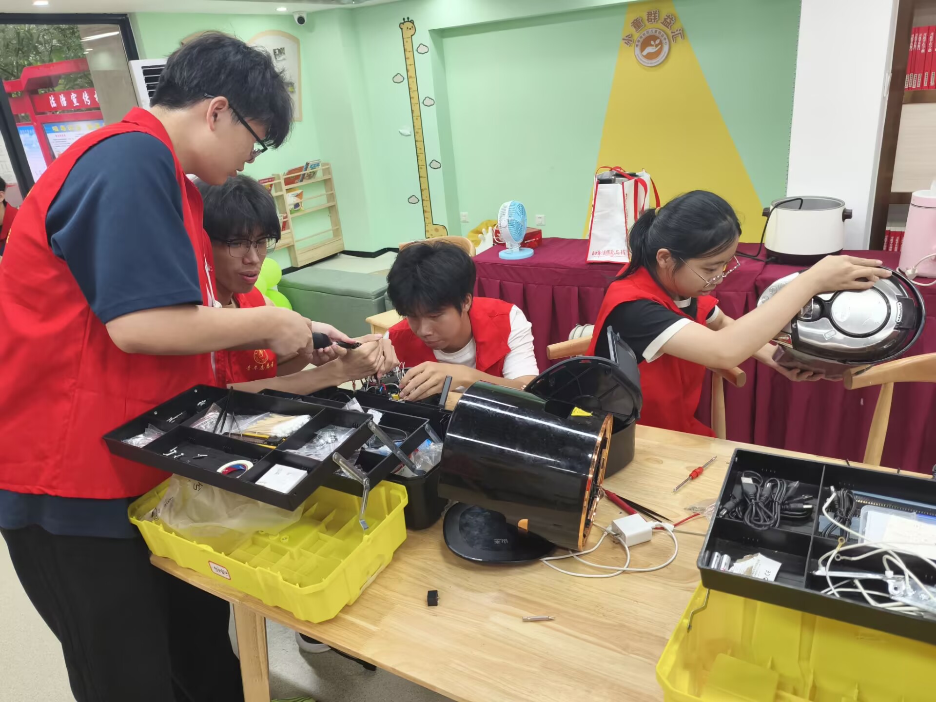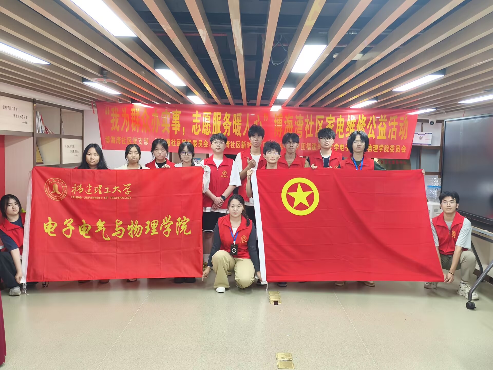 为切实解决社区居民日常生活中的家电维修难题,6月8日下午,电子电气与物理学院于校外青年志愿服务基地——闽侯县上街镇博海湾社区开展“我为群众办实事”家电义务维修活动。本次活动由院团委主办,院团委青年志愿者工作部、电子协会/e小电志愿服务队团支部联合承办。