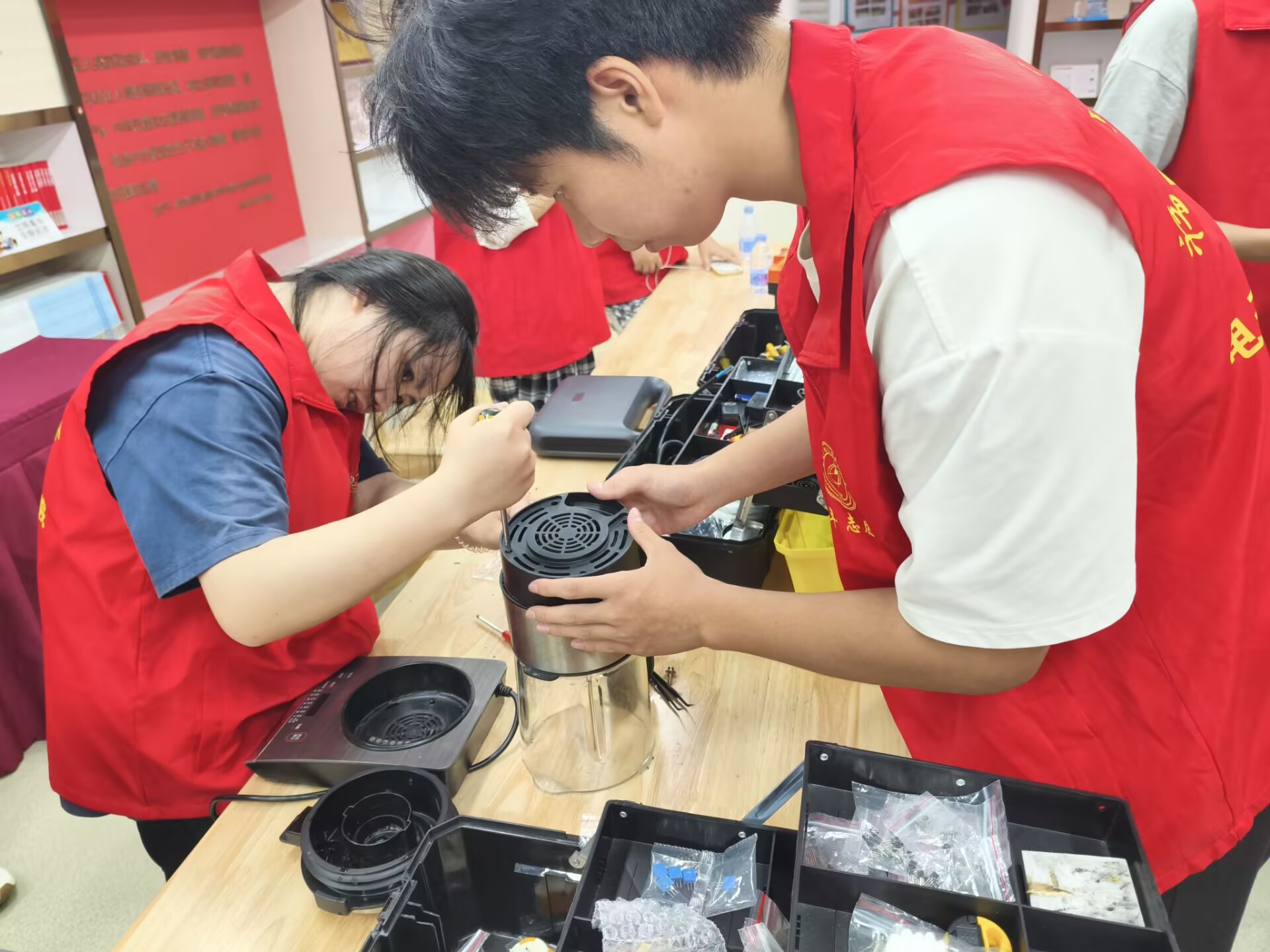 活动现场,志愿者们依托专业优势分组协作,有序开展检修服务。针对居民送来的电风扇、电磁炉等小家电,他们先用工具细致检测故障,精准排查线路老化、零件损坏等问题,对可修复设备当场完成维修。同时,志愿者主动向居民讲解家电安全使用规范,提升居家用电安全意识。活动全程,我院学子以严谨的专业态度、热情的服务作风,切实为社区群众解决了“小电器、大麻烦”的生活难题,赢得一致好评。