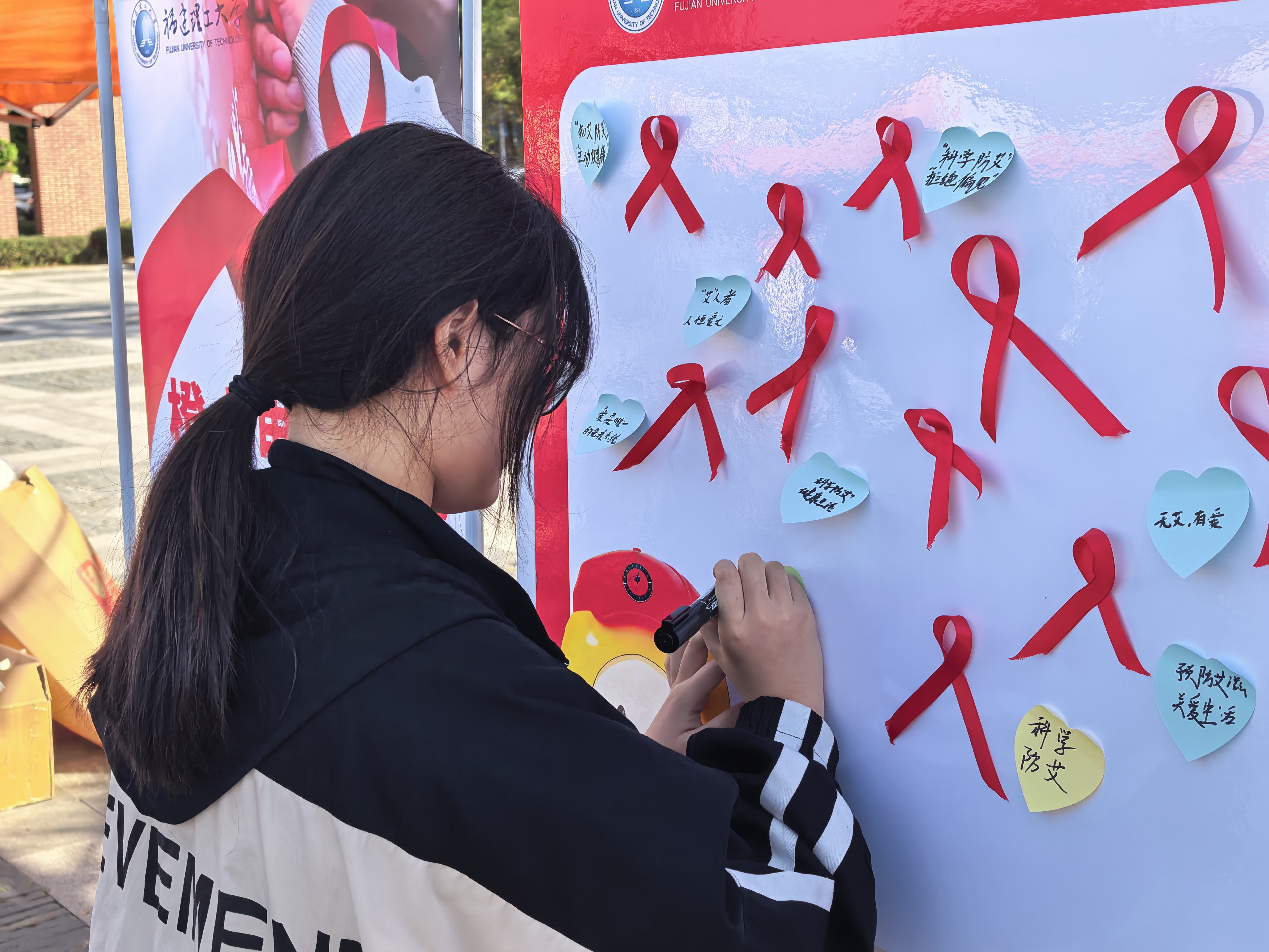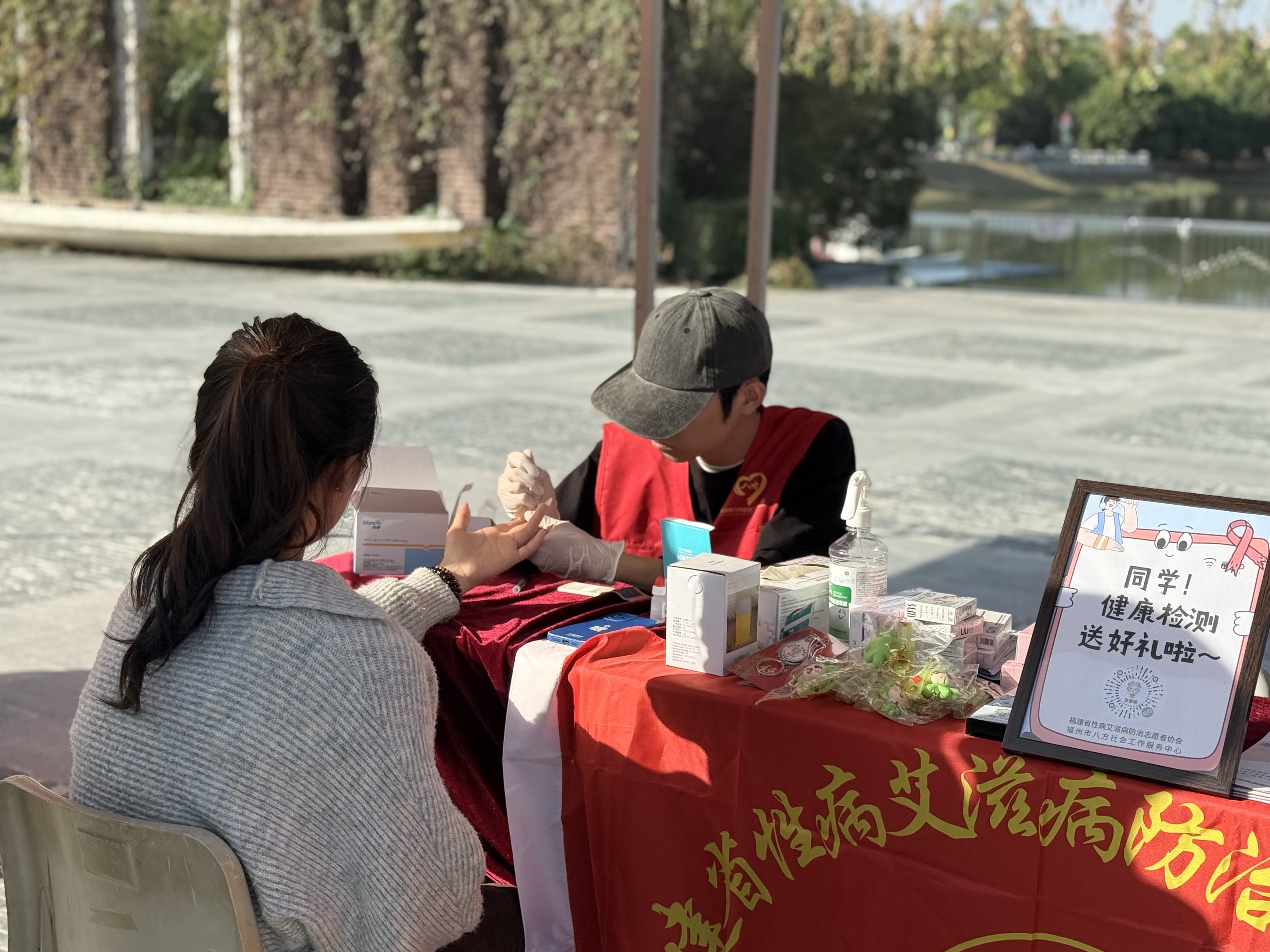 活动设置了“撕掉标签,拥抱接纳”“防艾大转盘”等小游戏,现场还有“红丝带留言墙”合影。同学们在这些别出心裁的环节中积极交流,于游戏的过程里全方位学习了艾滋病的预防知识、传播途径以及反歧视理念。此外,活动特别邀请了福建省艾协的工作人员,在现场设置了检测与咨询点。他们为师生们提供了专业的HIV快速检测服务和一对一咨询服务,用权威的知识和温暖的态度,为大家筑牢了身心健康的坚实防线,成为游园会中一道专业而温暖的风景线。