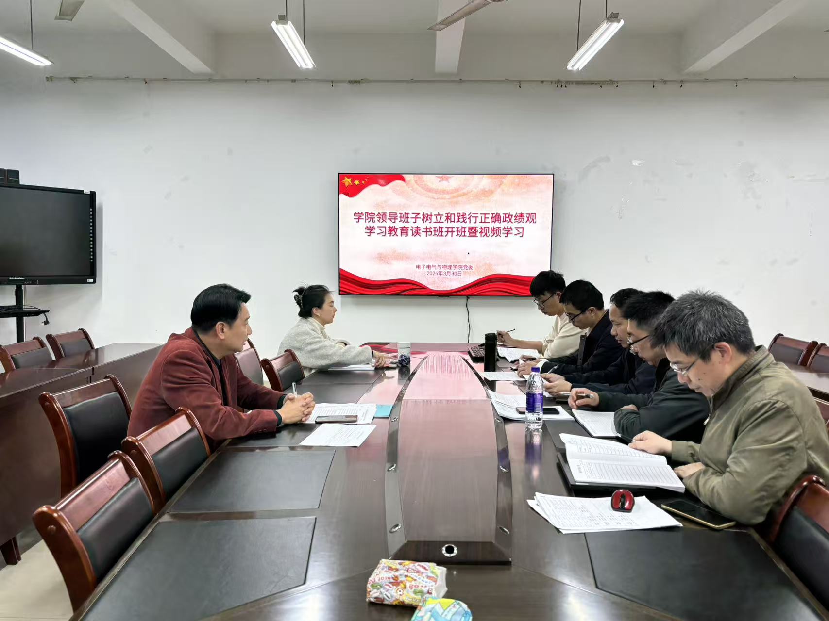 3月30日下午,电子电气与物理学院领导班子树立和践行正确政绩观学习教育读书班开班式暨集中学习在至诚楼206会议室举行。院党委书记林文主持开班式并讲话,学院党政班子成员、党委委员参加学习。
